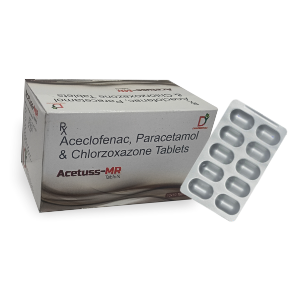 Acetuss-MR Tablets are a powerful combination of Aceclofenac (100mg), Paracetamol (325mg), and Chlorzoxazone (250mg). This triple-action formula is specially designed to relieve musculoskeletal pain, inflammation, and muscle spasms. It works by reducing pain and swelling while relaxing the muscles, providing fast and effective relief for conditions such as back pain, neck pain, and sports injuries.